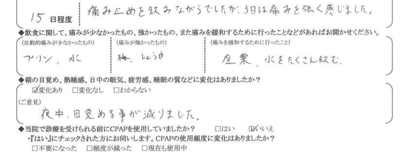 (痛みの程度について) 痛み止めを飲みながらでしたが、3日は痛みを強く感じました。