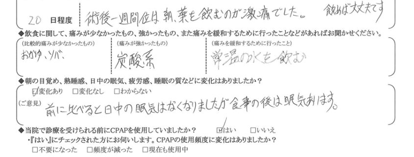 (ご意見) 前に比べると、日中の眠気は無くなりましたが、食事の後は眠気あります。