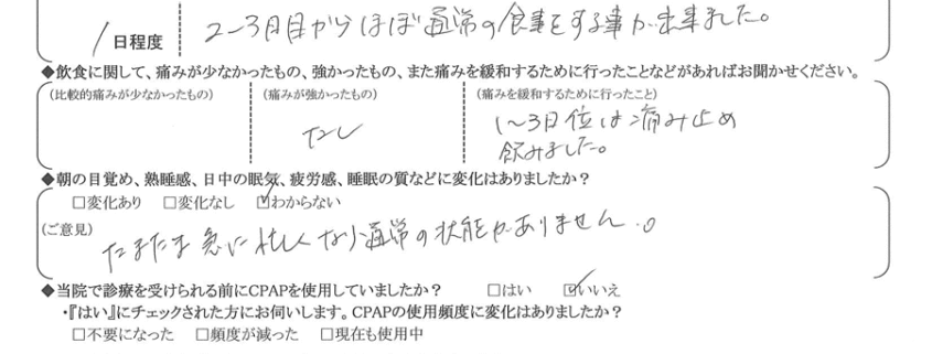 (痛みの程度について) 2~3日目からほぼ通常の食事をする事が出来ました。