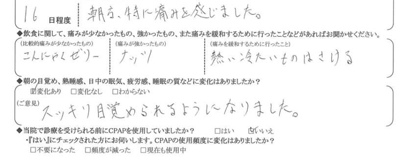 (痛みの程度について) 朝方、特に痛みを感じました。