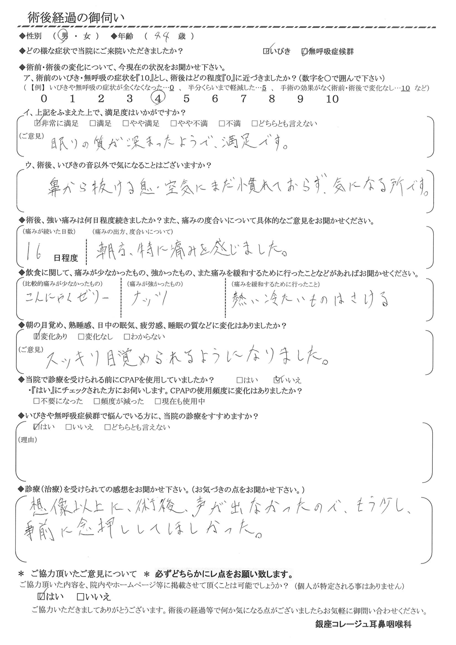 ア, 術前のいびき・無呼吸の症状を『10』だったとすると、術後はどの程度になりましたか? 【4】