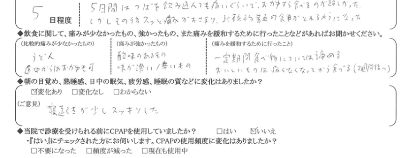 (痛みの程度について) 5日間は唾を飲み込んでも痛いぐらいで、お粥すら 食べるのが難しかった。