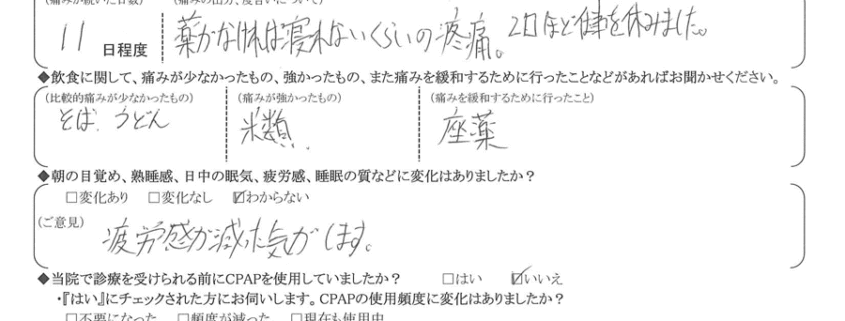 (痛みの程度について) 薬が無ければ寝られないくらいの疼痛。2日ほど仕事を休みました。