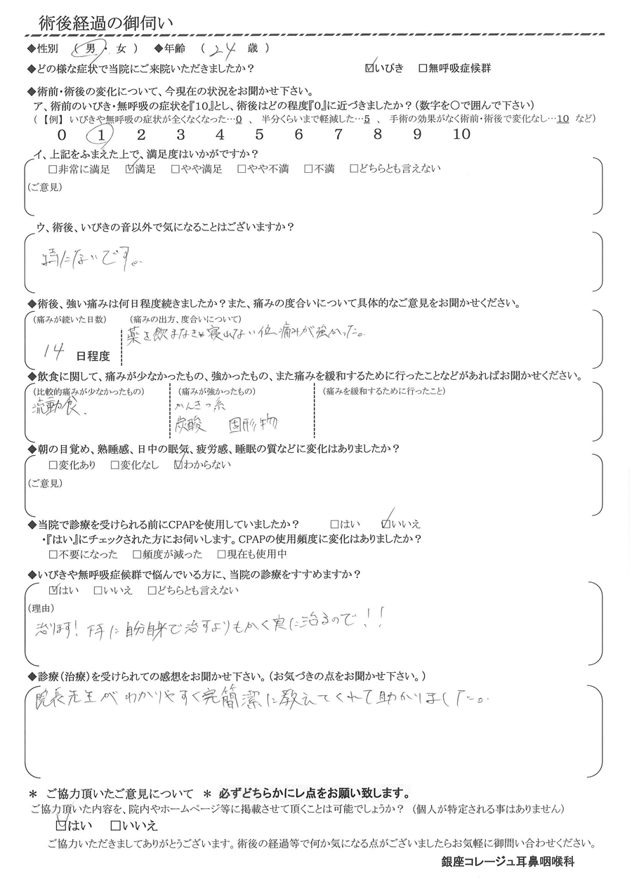 ア, 術前のいびき・無呼吸の症状を『10』だったとすると、術後はどの程度になりましたか? 【1】