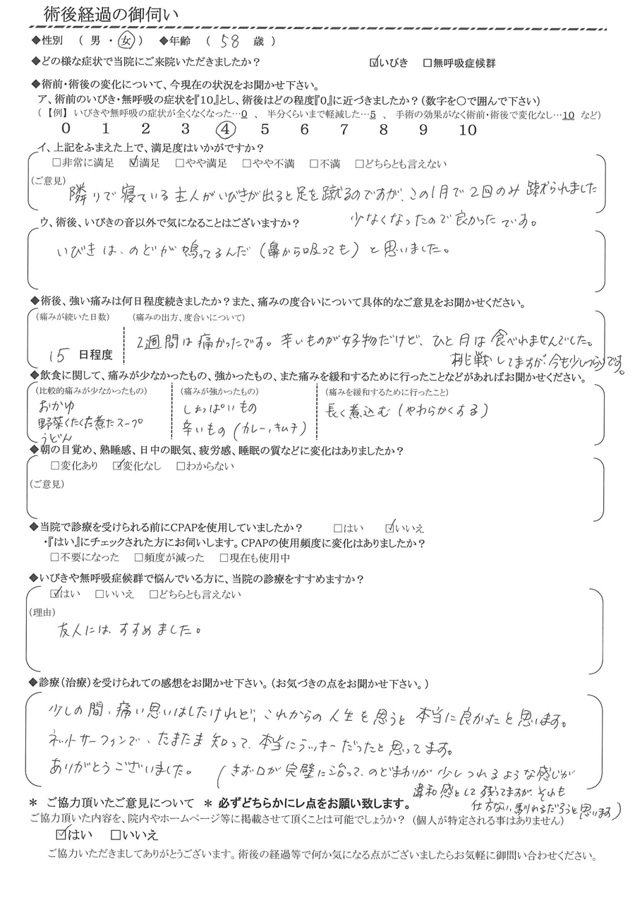 (ご意見)  隣で寝ている主人が、イビキが出ると足を蹴るのですが、この1月で2回のみ蹴られました。少なくなったので良かったです。