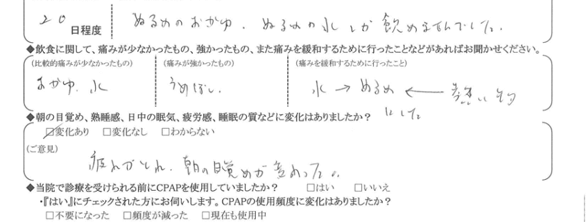(痛みの程度について) ぬるめのお粥・ぬるめの水しか飲めませんでした。