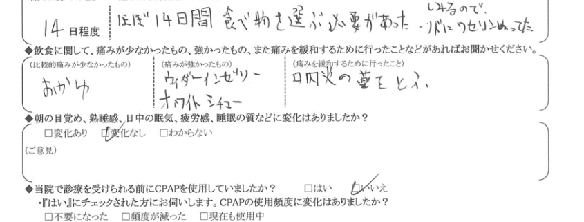 (痛みの程度について) ほぼ14日間、食べ物を選ぶ必要があった。沁みるので、喉にワセリン塗ってた。