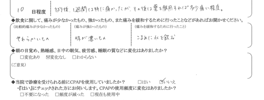 A: 術後は少し辛いが、いびきはかなり軽減されたので、やって良かった。