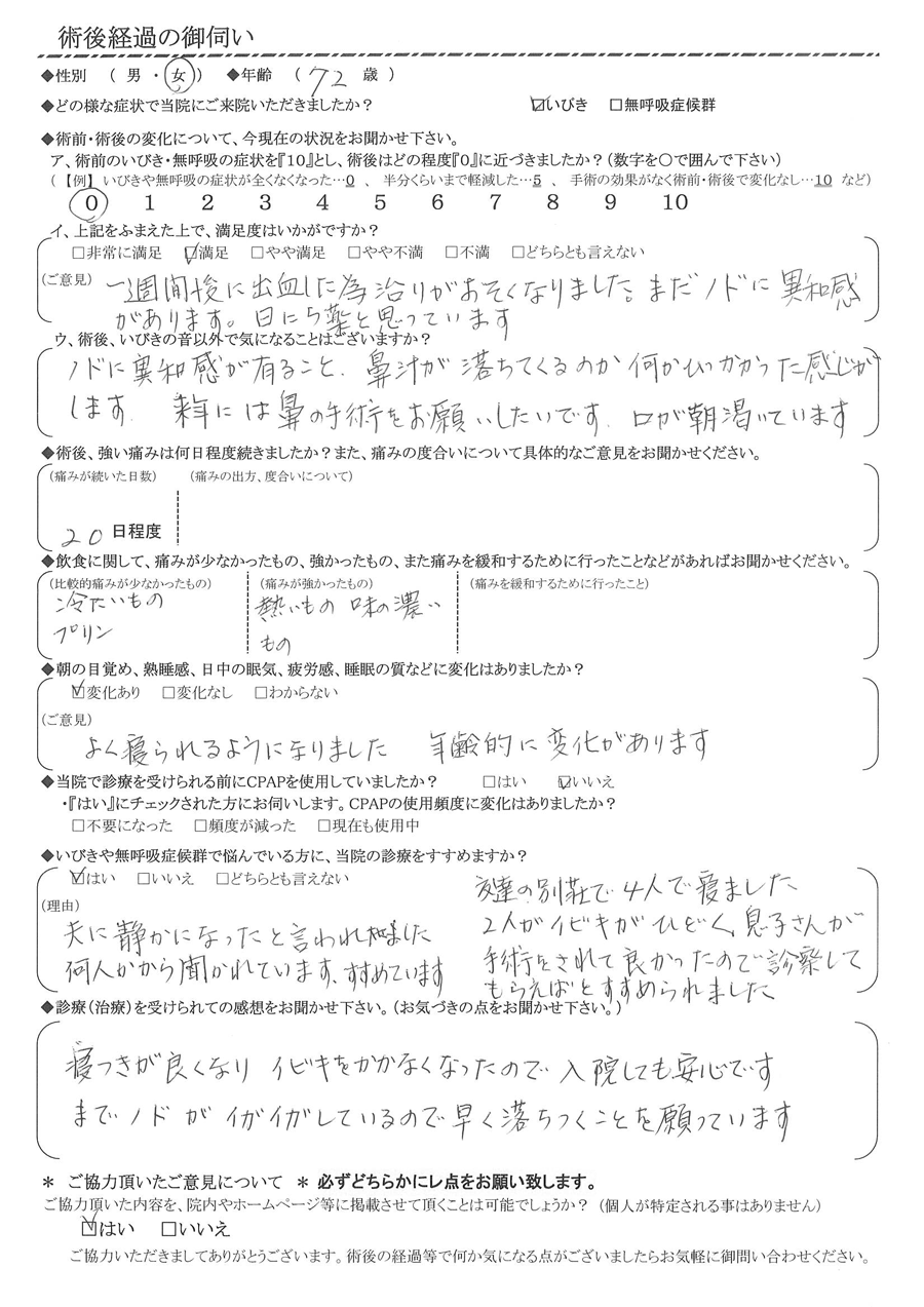 (理由) 夫に、静かになったと言われました。何人かから聞かれています。勧めています。友達の別荘で4人で寝ましたが。2人がイビキが酷く、息子さんが手術して良かったので診察してもらえばと勧められました。