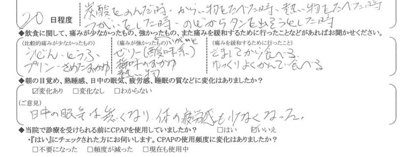 (ご意見) 無呼吸は無くなったようで、昼間、眠くなる事が無くなった。