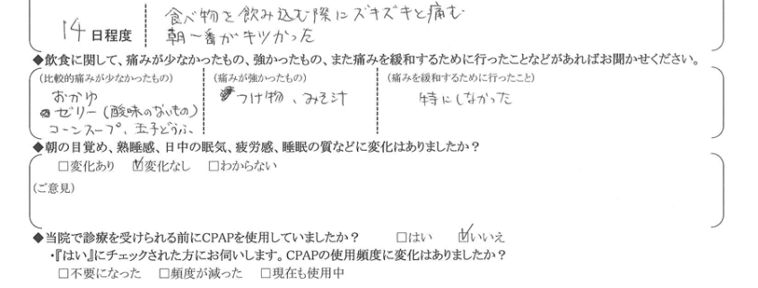 (痛みの程度について) 食べ物を飲み込む際に、ズキズキと痛む。朝一番がキツかった。