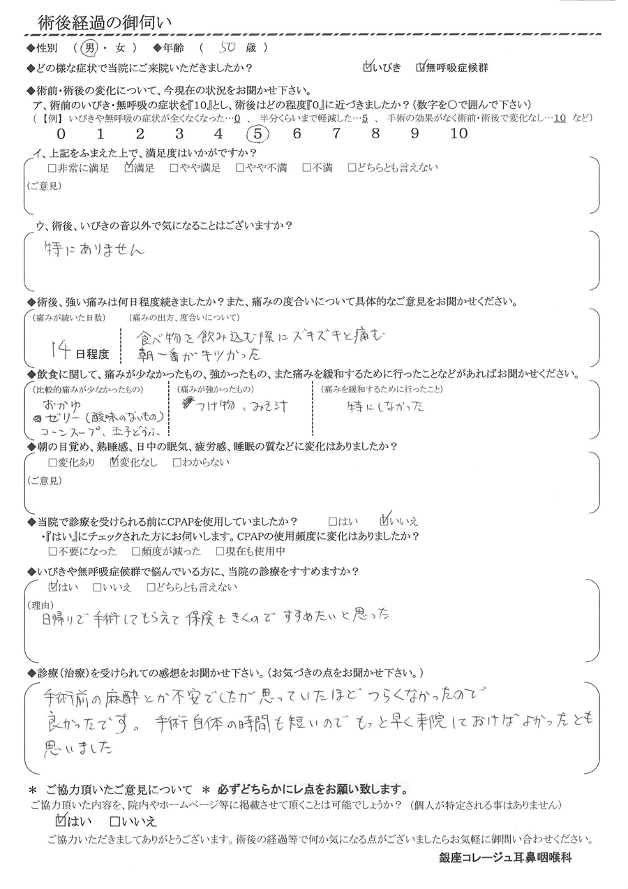 ア, 術前のいびき・無呼吸の症状を『10』だったとすると、術後はどの程度になりましたか? 【5】
