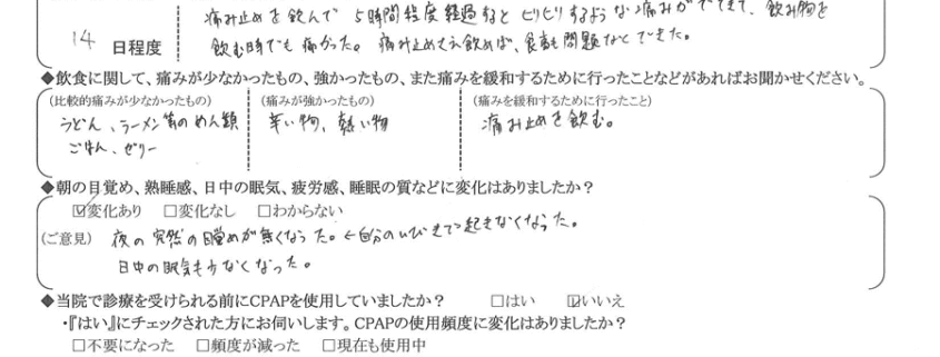 (ご意見)  夜の突然の目覚めが無くなった。←自分のイビキで起きなくなった。日中の眠気も少なくなった。