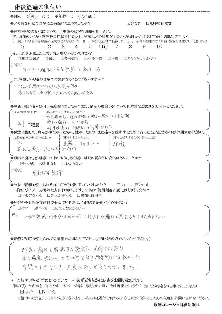 ア, 術前のいびき・無呼吸の症状を『10』だったとすると、術後はどの程度になりましたか? 【6】