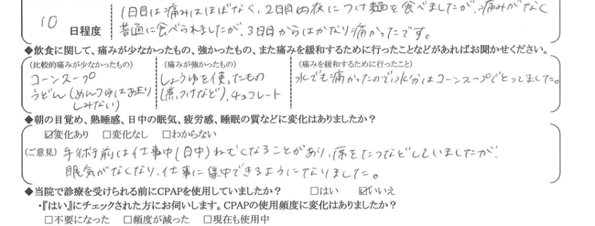 (ご意見) 手術前は仕事中(日中)眠くなる事があり、席を立つ等してましたが、眠気が無くなり、仕事に集中できるようになりました。