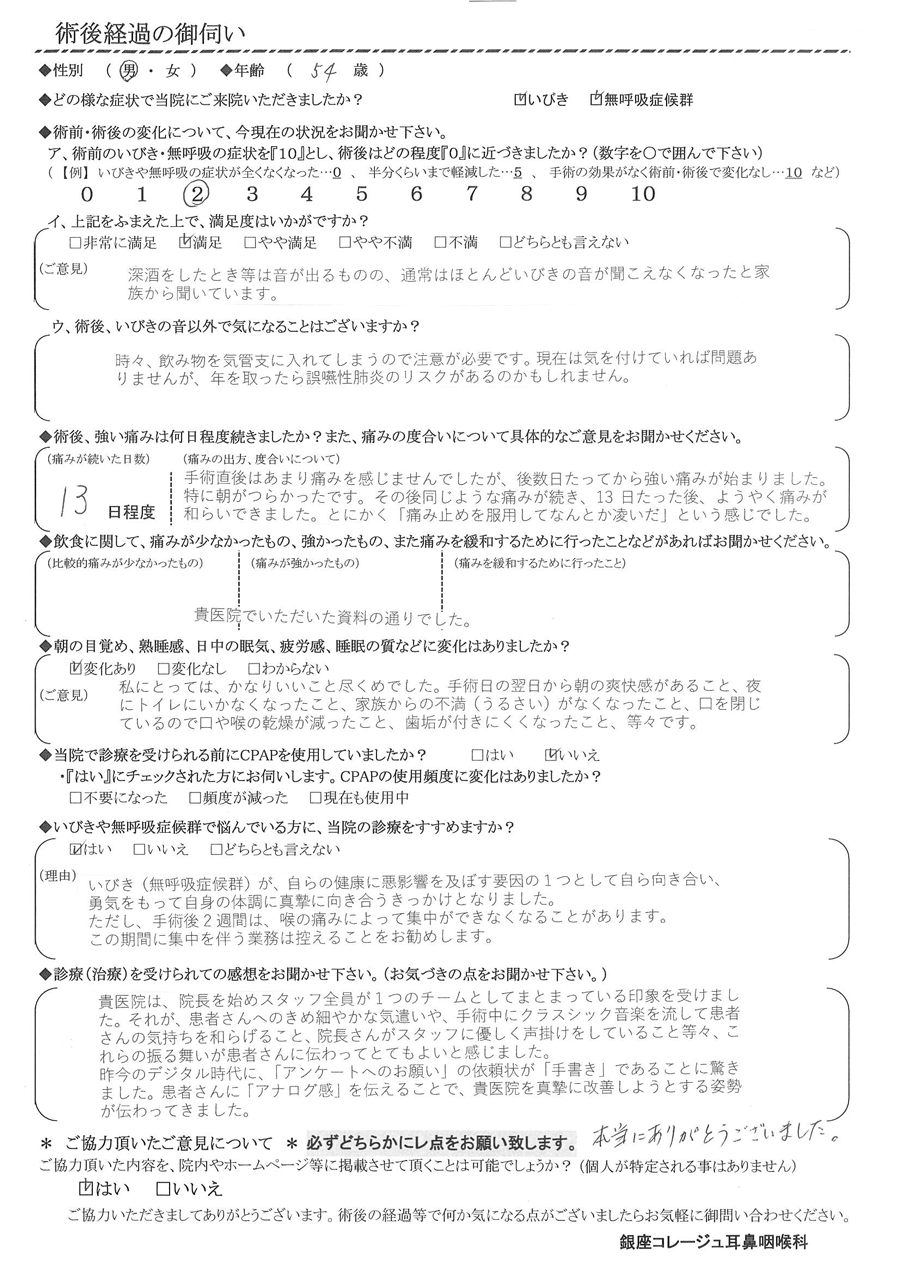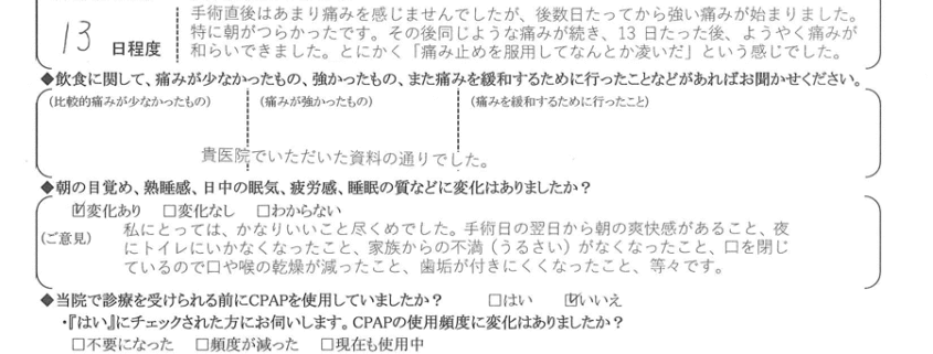 (ご意見) 私にとっては、かなり良いこと尽くめでした。手術日の翌日から朝の爽快感がある事、夜にトイレに行かなくなった事、家族から不満(うるさい)が無くなった事、口を閉じているので口や喉の乾燥が減った事、歯垢がつきにくくなった事、等々です。