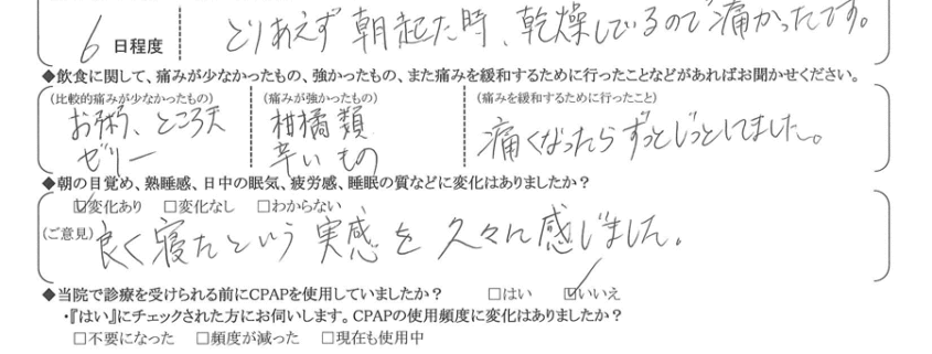 (痛みの程度について)  とりあえず、朝起きた時。乾燥しているので、痛かったです。