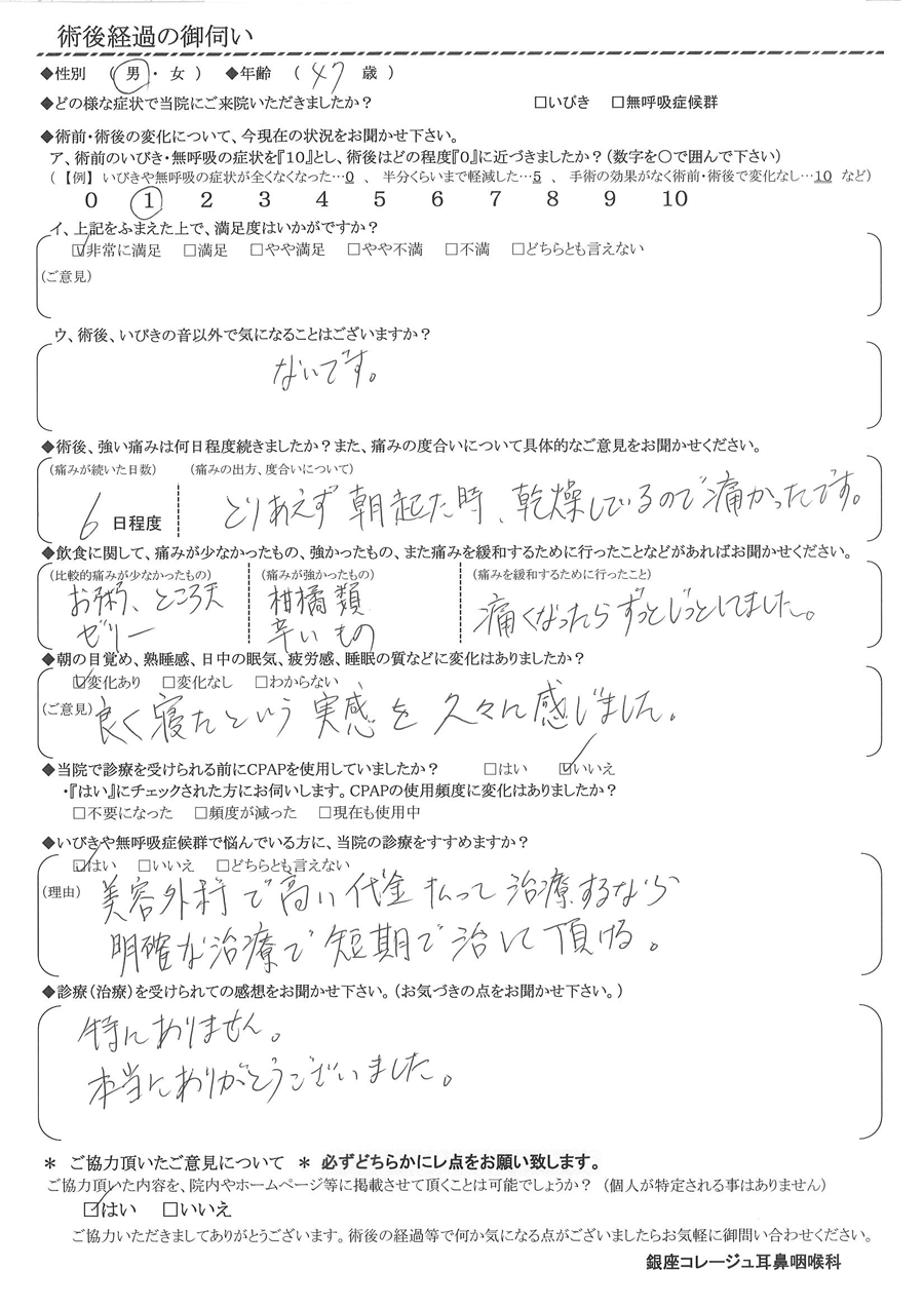 ア, 術前のいびき・無呼吸の症状を『10』だったとすると、術後はどの程度になりましたか? 【1】