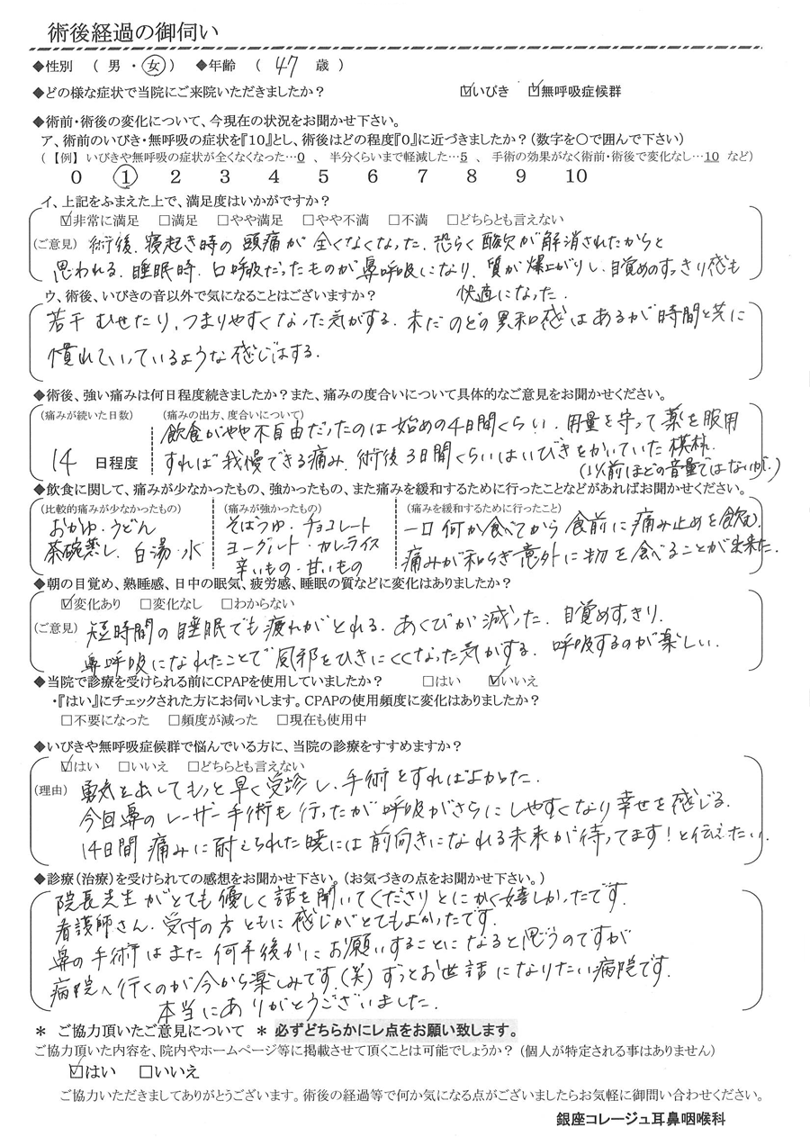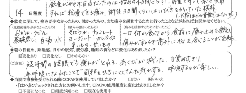(ご意見) 術後、寝起き時の頭痛が全くなくなった。恐らく、酸欠が解消されたからと思われる。睡眠時、口呼吸だったのもが鼻呼吸になり、質が爆上がりし、目覚めのスッキリ感も快適になった。
