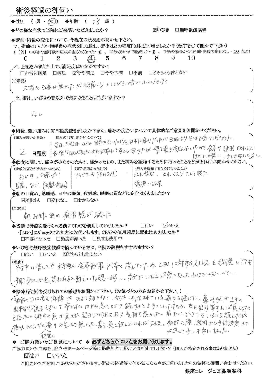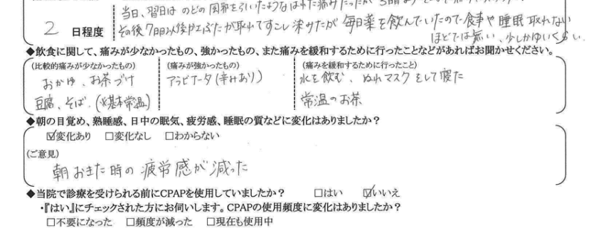 (ご意見)  大幅な改善は無かったが、術前よりはイビキの音が小さくなった。