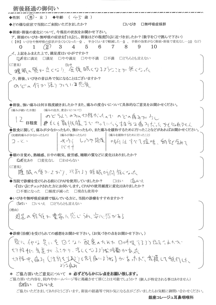ア, 術前のいびき・無呼吸の症状を『10』だったとすると、術後はどの程度になりましたか? 【2】