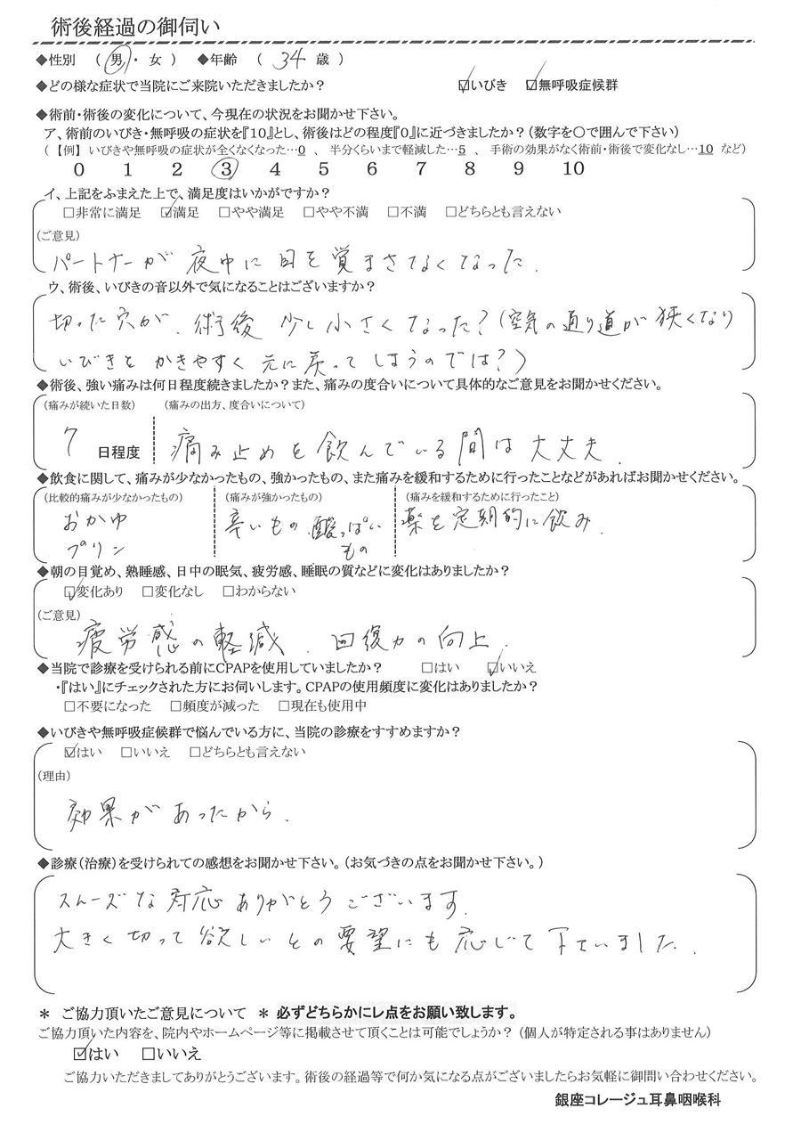 ア, 術前のいびき・無呼吸の症状を『10』だったとすると、術後はどの程度になりましたか? 【3】