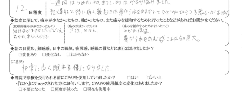 (痛みの程度について) 一週間は冷たい物・熱い物はかなり痛みました。乾燥すると特に痛く、寝起きは鼻から水を飲まないと、喉が引きつる感じがありました。