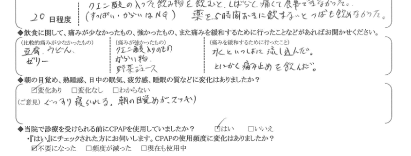 イビキは以前の1/10にいなりました。喉の奥に、引っかかる感じが残った。