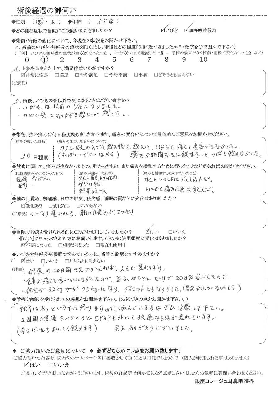 A: 手術はあっという間に終わりますので、悩んでいる方はぜひ治療をして下さい。2週間の禁酒は辛いけど、CPAPも外れて、快適な生活が送れています。(今はビールも美味しく飲めます。)先生ありがとうございました。