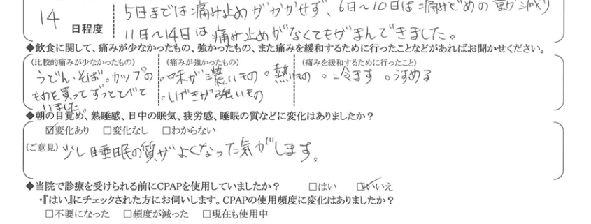 (痛みの程度について) 5日までは痛み止めが欠かせず、6日~10日は痛み止めの量が減り、11日~14日は痛み止めが無くても我慢できました。
