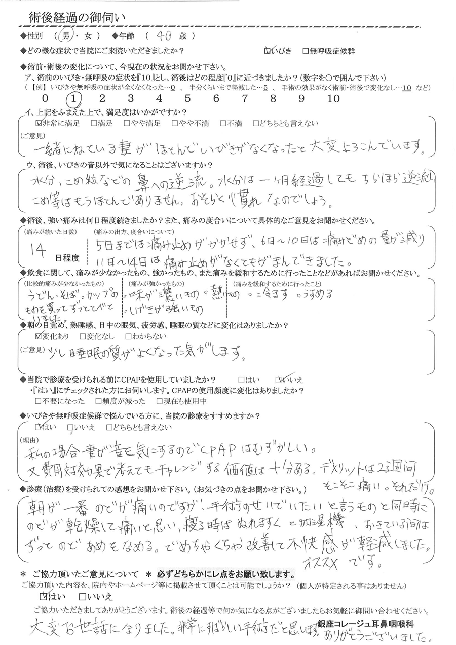 ア, 術前のいびき・無呼吸の症状を『10』だったとすると、術後はどの程度になりましたか? 【1】