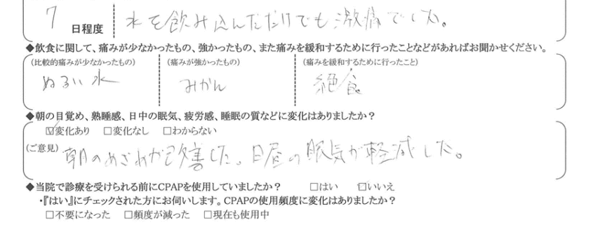 (痛みの程度について) 水を飲み込んだだけでも、激痛でした。