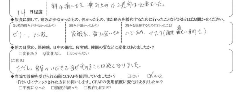 (ご意見) 効果は確認できました。しかし、イビキが完全に無くなる訳では無かった事が残念でした。(録音した結果)