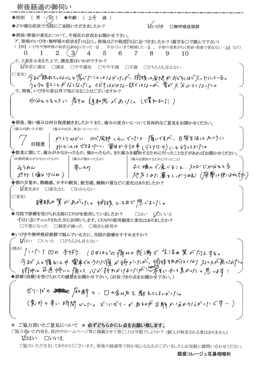 (ご意見) 今まで「眠れない」と感じた事は無かったが、術後に昼間が驚くほどスッキリしている。ウトウトする事が無くなった。イビキはかかない訳ではないが、音が大分小さくなった。