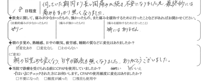 A: 無呼吸に関しては、ほぼ無くなり、日中の眠気も疲労感も無くなりました。こんなにハッキリ効果が出るのであれば、もっと早くに手術しておけば良かったと軽く後悔しております。周りの友人にも告知していきたいと思います。