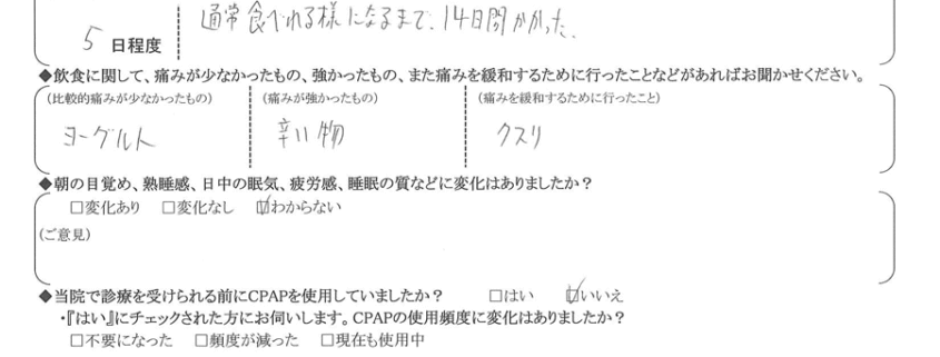 (痛みの程度について) 通常食べられる様になるまで、14日間かかった。