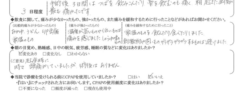 (ご意見) 起床時に、時々頭痛がしていましたが、術後はありません。
