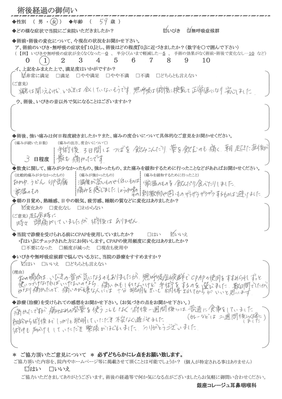 (ご意見) 寝息は聞こえるけど、イビキは全くしないそうです。無呼吸は術後に検査して正常値になり、安心しました。