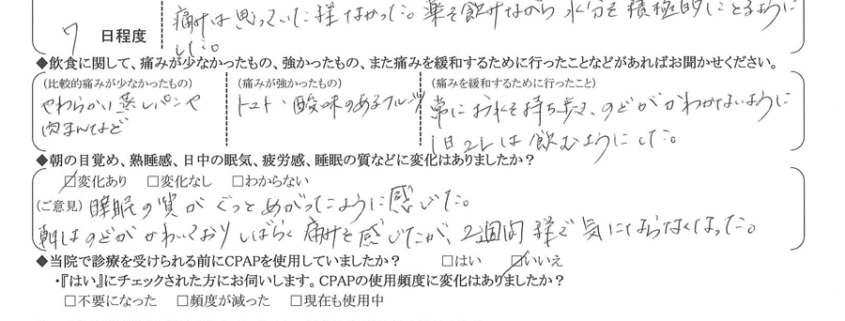 (ご意見) 睡眠の質がぐっと上がったように感じた。朝は喉が渇いており、しばらく痛みを感じたが、2週間程で気にならなくなった。