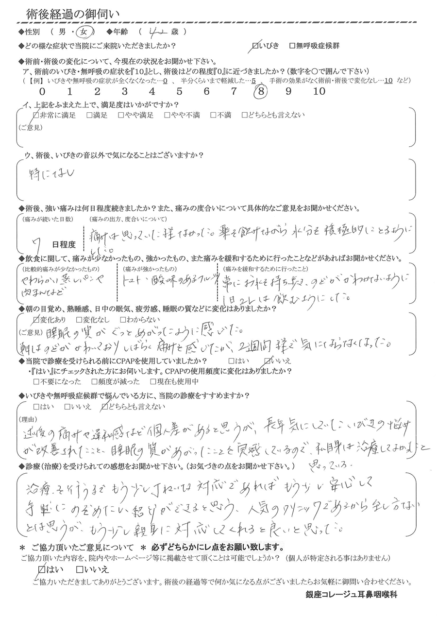 (理由) 術後の痛みや違和感など、個人差があると思うが、長年気にしていたイビキの悩みが改善されたこと。