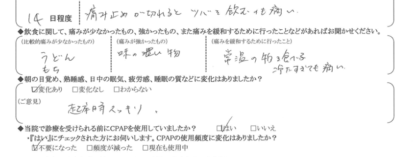 (痛みの程度について) 痛み止めが切れると、唾を飲むのも痛い。