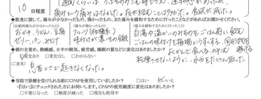 A:(痛みを緩和するために行ったこと) 白湯や温かい飲み物をご飯前に飲む・ご飯の味付けを極端に薄くする・固形物をよく噛んで食べる、飲み込む・乾燥させないように水分をたくさん摂った