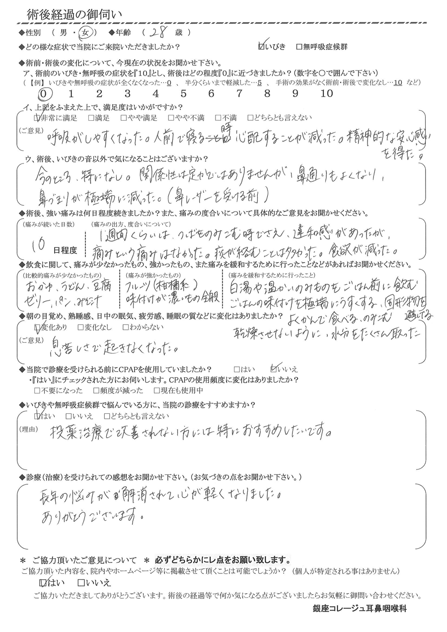 (ご意見) 呼吸がしやすくなった。人前で寝る時、心配する事が減った。精神的な安心感を得た。