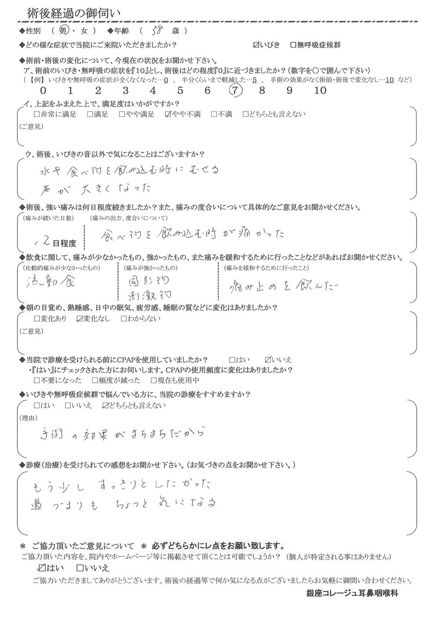ア, 術前のいびき・無呼吸の症状を『10』だったとすると、術後はどの程度になりましたか? 【7】
