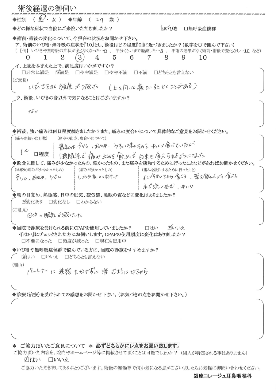 ア, 術前のいびき・無呼吸の症状を『10』だったとすると、術後はどの程度になりましたか? 【3】