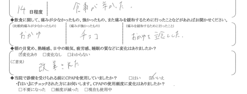 (痛みの程度について) 食事が辛かった。