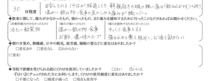 (痛みの程度について) 目安とされる14日が経過しても、朝寝起きの喉の強い痛み(飲み込む時)は残り、温かい飲み物・食事の度の沁みる痛みが続いた。