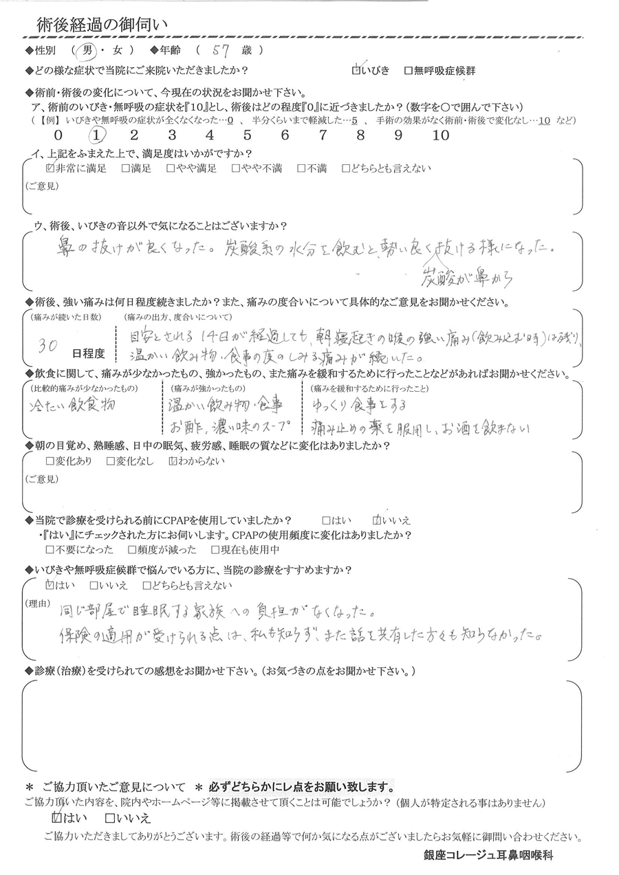 ア, 術前のいびき・無呼吸の症状を『10』だったとすると、術後はどの程度になりましたか? 【1】