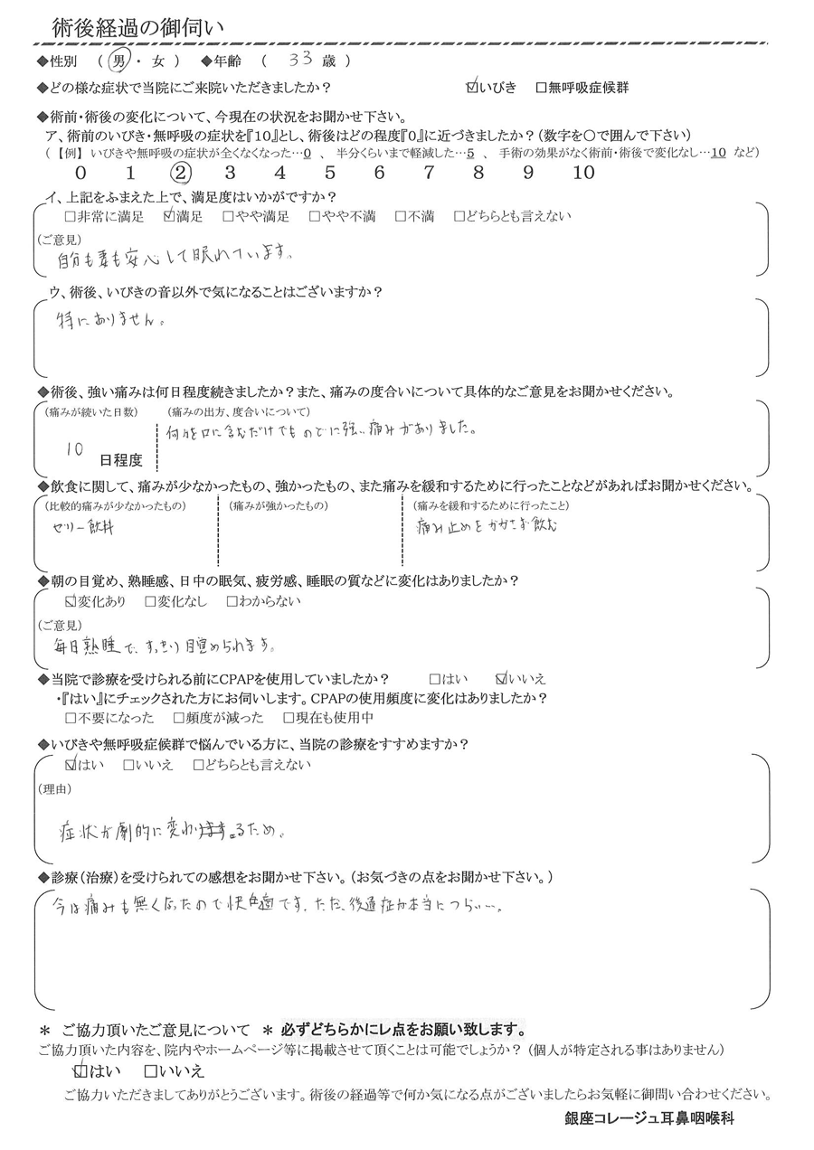 ア, 術前のいびき・無呼吸の症状を『10』だったとすると、術後はどの程度になりましたか? 【2】