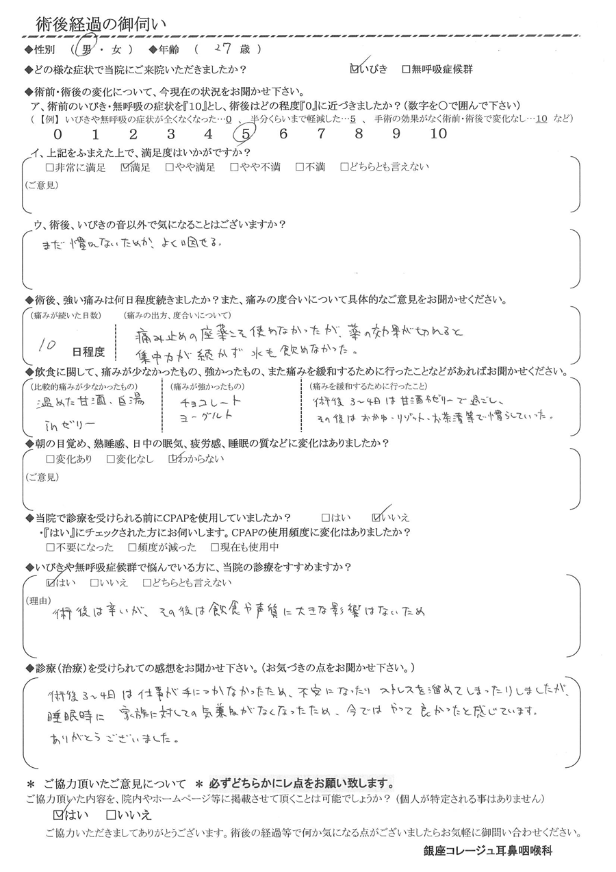 A: 術後3~4日は仕事が手につかなかった為、不安になったり、ストレスを溜めてしまったりしましたが、睡眠時に家族に対しての気兼ねが無くなったため、今ではやって良かったと感じています。ありがとうございました。